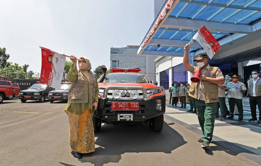 Dari halaman gedung IS Plaza di bilangan Pramuka, Jakarta Timur, Ketua Satgas Penanganan Covid-19 Letjen TNI Ganip Warsito melepas keberangkatan Mobil Makser BNPB beserta para rombongan secara simbolis dengan mengangkat bendera.
