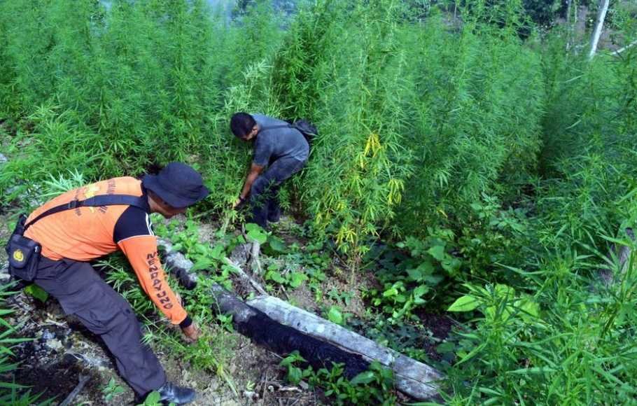 Badan Narkotika Nasional (BNN) memusnahkan ladang ganja dengan luas seluruhnya mencapai dua hektare di Mandailing Natal, Sumatera Utara, Selasa (24/8/2021). Sebanyak 134 personil gabungan dari BNN, Polri, TNI, dan instansi terkait dikerahkan untuk memusnahkan ladang yang ditanami sekitar 12.000 pohon ganja dengan berat seluruhnya sekitar enam ton tersebut.