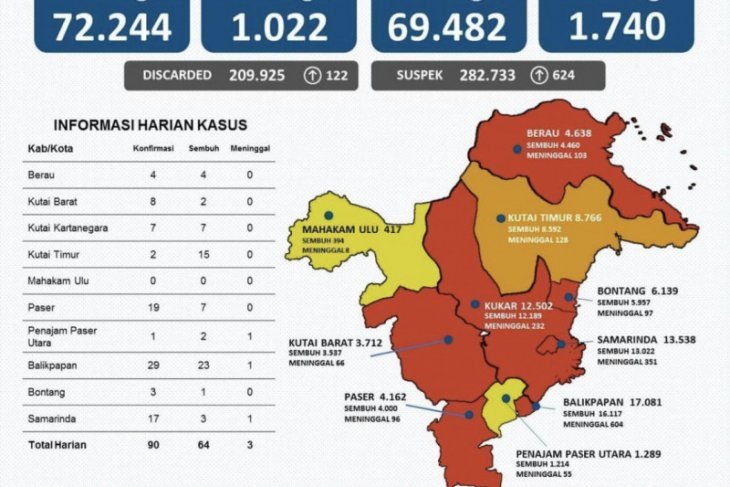 ” Akumulasi kasus terkonfirmasi positif COVID-19 di Kaltim sebanyak 72.224 kasus, sedangkan kasus yang telah dinyatakan sembuh sebanyak 69.482 kasus,” kata Andi M Ishak.