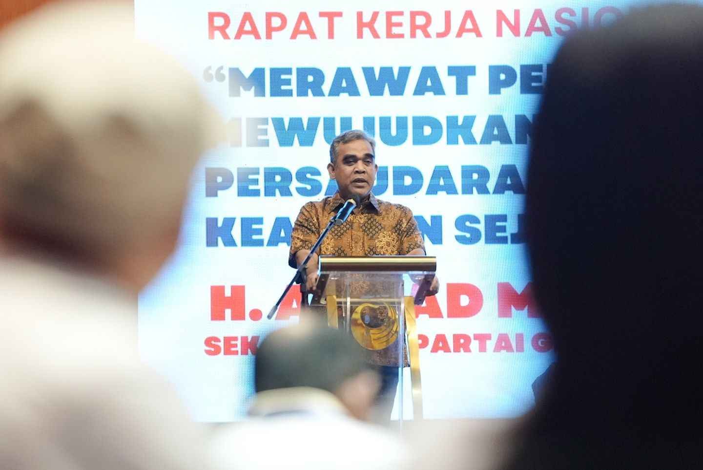 Sekjen Partai Gerindra Ahmad Muzani hadir dalam acara Rapat Kerja Nasional Gerakan Kristiani Indonesia Raya (GEKIRA) di Hotel Bidakara, Sabtu (3/8). GEKIRA adalah salah satu organisasi sayap Partai Gerindra yang diketuai oleh Farry Djemy Francis, anggota DPR RI 2014-2019.